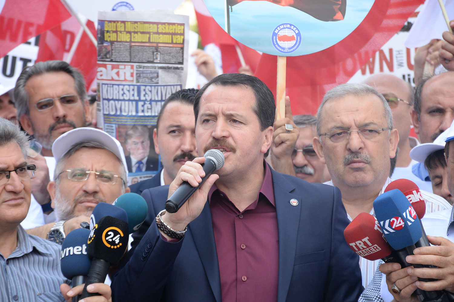 Buradan açıkça ifade ediyoruz: Türkiye için artık en büyük tehdit ve problem ABD’dir. ABD, Türkiye’yi ambargolarla, tehditlerle, şantajlarla rehin almak istemektedir. Bu süreç 15 Temmuz’da sekteye uğrayan saldırının açık bir devamıdır. Ama başaramayacak, zilleti tadacaktır. Biz bir milyonu aşan üyemizle, Memur-Sen ailesi olarak, Bugün burada tepki veren sivil insanlar olarak diyoruz ki; ABD yanlıştan dönmezse misliyle karşılık verilmelidir. Terör örgütleri üzerinden Türkiye’yi çökertmeye çalışan ABD’nin İncirlik başta olmak üzere bütün askeri üsleri derhal kapatılmalıdır. ABD tehditleri karşısında dünün antiemperyalist bugünün müstemlekecileri salya akıtsa da; 15 Temmuz’un terini henüz silmemiş bir millet olarak meydanı zorbalara bırakacak değiliz. Dün Çanakkale’de, Kut’ül Amare’de, İstiklal Harbinde rezil rüsva ettiklerimiz, Bugün kan kokusu almış sırtlanlar gibi etrafımızı kuşatsa da; Yaramızı sarar ve çıkıp hesabı görür, defteri