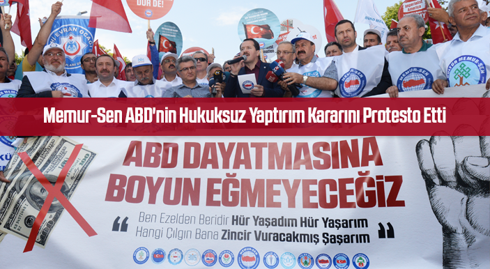 Memur-Sen, Amerika Birleşik Devletleri'nin Türkiye'ye karşı hukuksuz yaptırımını ABD Büyükelçiliği önünde protesto etti. Memur-Sen Genel Başkanı Ali Yalçın, Memur-Sen ve bağlı sendikaların yönetim kurulu üyelerinin de katılım sağladığı eyleme çok sayıda vatandaş da iştirak ederek ABD'ye yönelik tepkilerini dile getirdi.