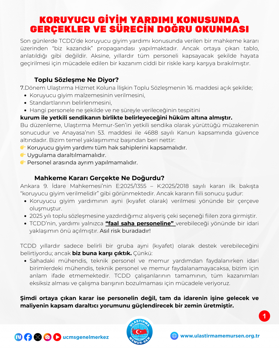 Son günlerde TCDD’de koruyucu giyim yardımı konusunda verilen bir mahkeme kararı üzerinden “biz kazandık” propagandası yapılmaktadır. Ancak ortaya çıkan tablo, anlatıldığı gibi değildir. Aksine, yıllardır tüm personeli kapsayacak şekilde hayata geçirilmesi için mücadele edilen bir kazanım ciddi bir riskle karşı karşıya bırakılmıştır.