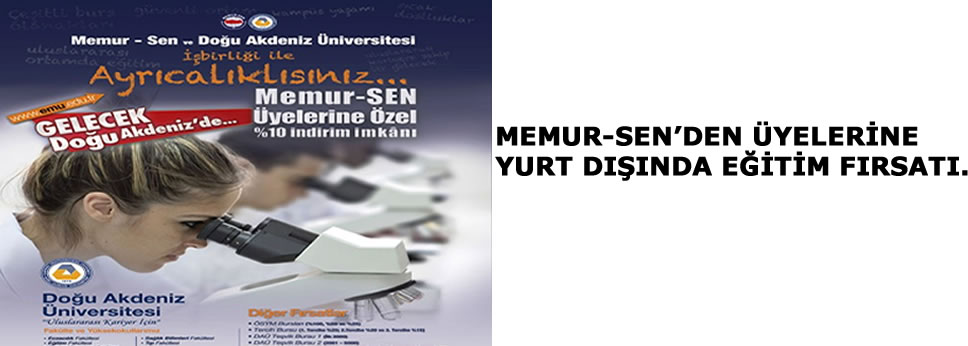 Memur-Sen, Doğu Akdeniz Üniversitesi ile imzaladığı protokol ile bağlı sendikalarının üyelerine, eş ve çocuklarına KKTC Doğu Akdeniz Üniversitesi’nde indirimli ön lisans ve lisans eğitim fırsatı sağlıyor.