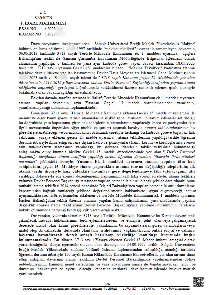 Ulaştırma Memur-Sen Avukatı Mankır tarafından, “Samsun Çarşamba Havalimanı Müdürlüğünde Bilgisayar İşletmeni olarak görev yapan davacı tarafından, 3713 sayılı Terörle Mücadele Kanunu’nun Geçici 15.maddesi kapsamında “tekniker” kadrosuna atanma talebiyle yaptığı başvurusunun reddine ilişkin DHMİ Genel Müdürlüğü’nün …/…/2023 tarih ve E……. Sayılı işleminin hukuka aykırı olduğu, 3713 sayılı Kanunun Geçici 15.maddesi uyarınca kendisine verilen haktan yararlanmak suretiyle mezuniyetine uygun makine teknikeri pozisyonuna geçmek için davalı idareye yaptığı başvurunun davalı idarece reddedilmesi ile kanunen kendisine tanınan hakkın elinden alındığını, somut durumda tekniker pozisyonuna geçmek için mevzuatta aranan tüm şartları yerine getirmesine rağmen yorum yolu ile anılı haktan yararlanmasının önüne geçildiği; 3713 sayılı Kanunun Ek 1.maddesi uyarınca ataması yapıldığından; aynı Yasanın Geçici 15. Madde hükmünden faydalanması gerektiği hususunda şüphe bulunmadığı; ilk atamasının yapıldığı tarih olan 06.05.2013 tarihi itibariyle de şartları taşımasına rağmen, atamasının Bilgisayar İşletmeni kadrosuna yapıldığı, davalı idarenin ret kararının keyfi nitelikte bir işlem olduğu, ilgili mevzuat gereği hiçbir sınav şartı aranmaksızın “Bilgisayar İşletmeni” kadrosundan, “Tekniker” kadrosuna geçiş hususunda tüm şartları sağlamasına ve kendisi ile aynı şartlarda olan kişileri emsal göstermesine rağmen hukuka aykırı bir şekilde Devlet Personel Başkanlığı’nın görüşü gerekçe gösterilerek, tekniker kadrosuna geçişini reddeden davalı idare işleminin hukuka aykırı olduğu” mahkemeye bildirilmiştir.