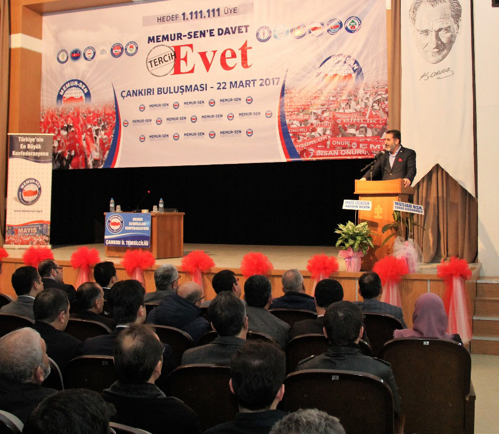 Memur-Sen Çankırı İl Başkanı Kasım Karatekinde “16 Nisan'da milletimiz, istikrarımız, istiklalimiz ve istikbalimiz için ‘Evet’ diyeceğiz. Birliğimizi ve kardeşliğimizi yıkmak isteyen emperyalistlerin ve onların piyonlarının oyunlarını bozmak için, büyük ve güçlü Türkiye için, vatanımız, bayrağımız için Memur-Senolarak evet diyoruz” şeklinde konuştu.