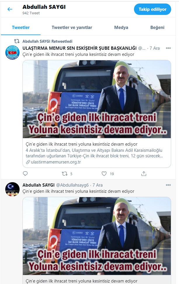 Ulaştırma Memur-Sen, 4 Aralık'ta İstanbul'dan, Ulaştırma ve Altyapı Bakanı Adil Karaismailoğlu tarafından uğurlanan Türkiye-Çin ilk ihracat blok treni hakkında Hükümeti, Ulaştırma Bakanlığı’nı ve TCDD’yi yıpratma amaçlı ortaya atılan yalan haberler ve dezenformasyon girişimi üzerine, Genel Merkez ve tüm Teşkilatları ile birlikte İnternet ve Sosyal Medya ağlarından harekete geçerek, yalan haber ve dezenformasyonları açığa çıkarmak üzere harekete geçti.