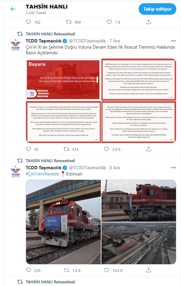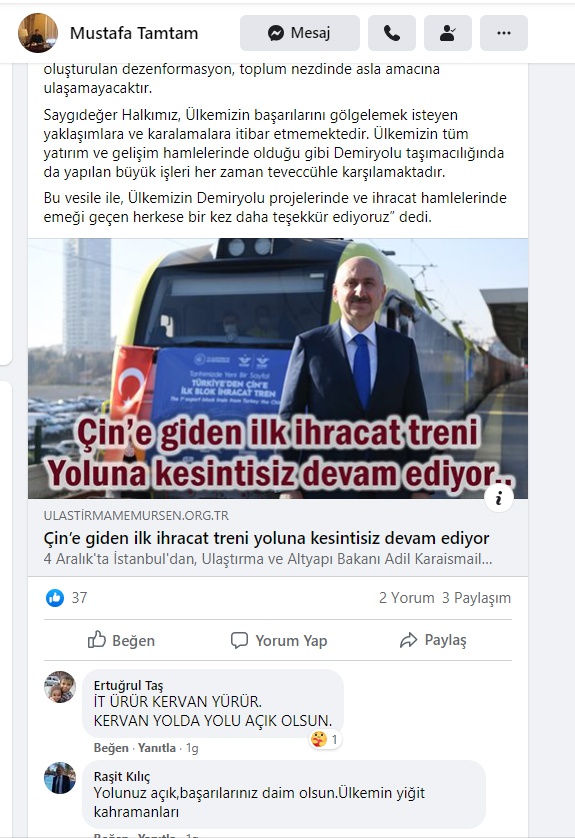 Ulaştırma Memur-Sen Genel Başkanı Kenan Çalışkan konu ile ilgili olarak yaptığı açıklamada, “Avrupa’dan Çin’e kesintisiz olarak yük ve yolcu taşımacılığının demiryolu aracılığı ile yapılabilmesi, ülkemizin hayata geçirdiği Marmaray Projesi ve Anadolu boyunca kesintisiz hale getirilmiş demiryolları yatırımları sayesinde mümkün olmuştur.