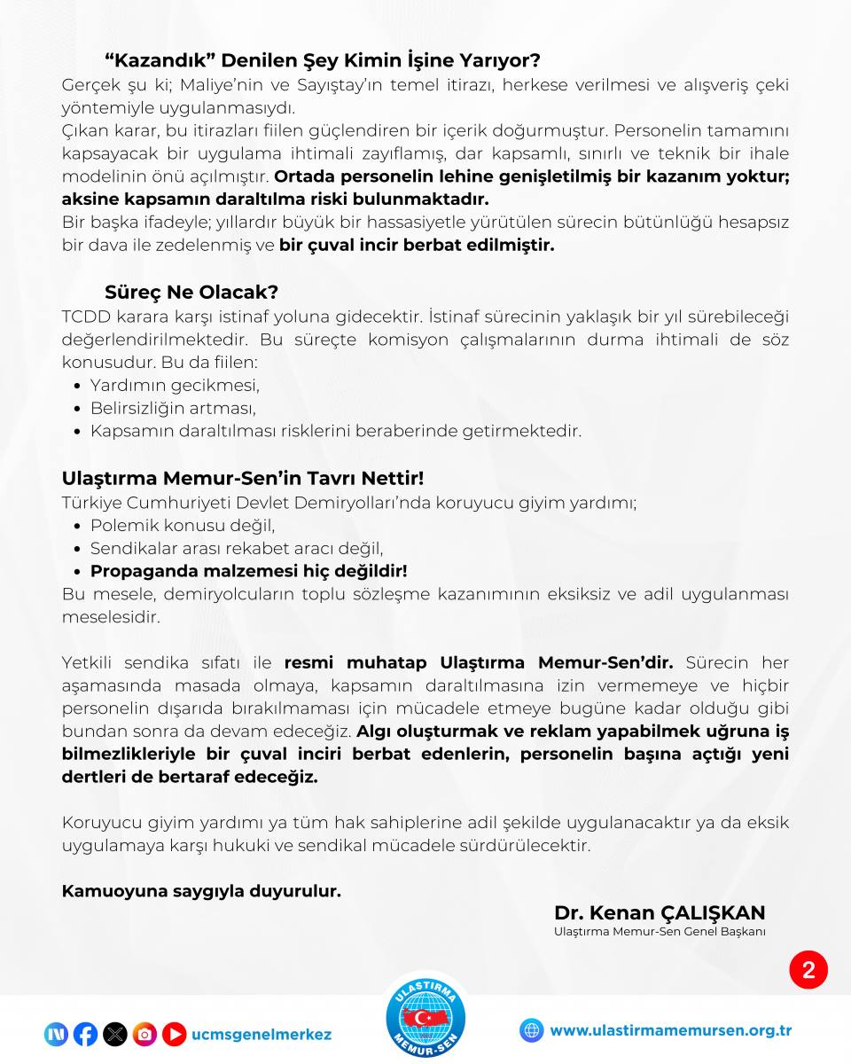 Bu düzenleme, Ulaştırma Memur-Sen’in yetkili sendika olarak yürüttüğü müzakerenin sonucudur ve Anayasa’nın 53. maddesi ile 4688 sayılı Kanun kapsamında güvence altındadır. Bizim temel yaklaşımımız başından beri nettir: