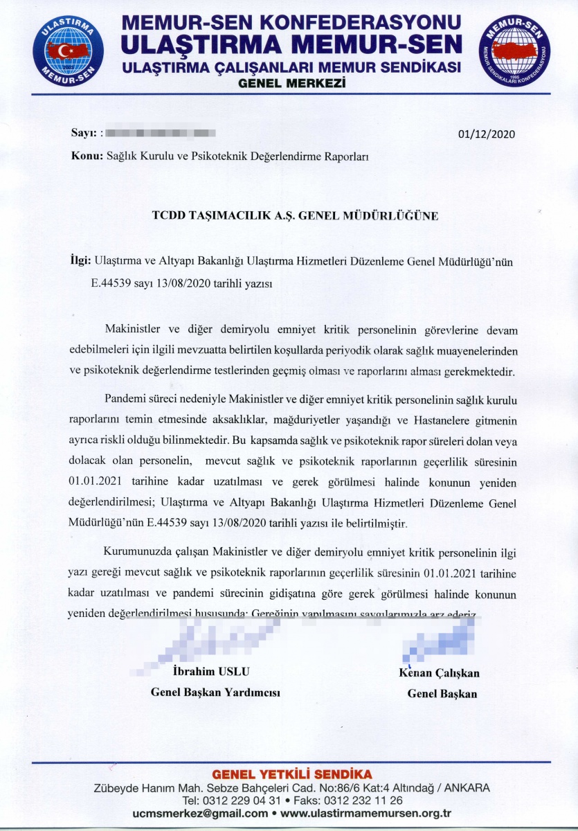 Ulaştırma Memur-Sen, ilk olarak, 1 Aralık 2020 tarihinde TCDD Taşımacılık A.Ş.’den, Makinistler ve diğer demiryolu emniyet kritik personelinin görevlerine devam edebilmeleri için gerekli olan sağlık muayene ve psikoteknik değerlendirme testleri yenileme işlemlerinin, pandemi sebebiyle yıl sonuna kadar uzatılması ve sonrasında da gerek görülmesi halinde konunun yeniden değerlendirilmesini istemiş ve kuruma yazılı başvuruda bulunmuştu.