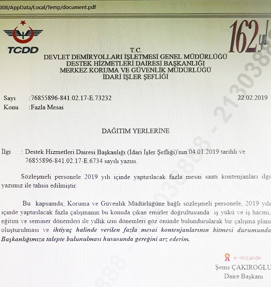 Genel Müdürlüğün, 76855896-841.02.17-E.73232 sayılı ve 22.02.2019 tarihli aşağıdaki yazısıyla Koruma Güvenlik görevlisi personelinin fazla mesai sorunu çözüme kavuştu.