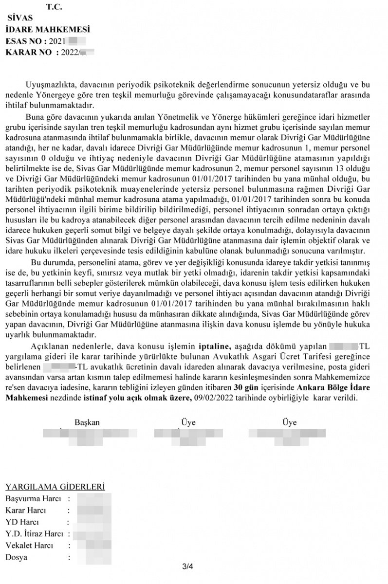 Ulaştırma Memur-Sen Avukatı H. Muharrem Mankır’ın, Sivas İdare Mahkemesinde açtığı davada Mahkeme; “TCCD İşletmesi Genel Müdürlüğü 4. Bölge Müdürlüğü Sivas Gar Müdürlüğünde tren teşkil memuru olarak görev yapmakta olan üyemizin ……. tarih ve …..sayılı işlemin; keyfi ve hukuka aykırı olduğu, davacının itirazlarının dikkate alınmadığı, birçok personelin sağlık ve psikoteknik muayenesinden başarısız olduğu ancak sadece davacının başka yere atandığı, davacının aile birliğinin, psikolojisinin ve huzurunun bozulduğu, annesi ve kayın validesinin hasta olduğu, kayın babasının %92 engelli olduğu, 3 ayrı ağır hastaya bakmak zorunda olduğu, atandığı yerde kesinlikle hizmetine ihtiyaç olmadığı, 2. istasyon şefi olarak norm kadroda olduğu, ayrıldığı yerde istasyon şefinin vekaleten görevlendirildiği, takdir yetkisinin kamu yararı ve hizmet gereği ilklerine aykırı kullanıldığı ve aynı yerde memur olarak göreve devam edebilecekken Divriği ilçesine atanmasının anlamsız ve hukuksuz olduğu” gerekçesiyle atamayı iptal etti.
